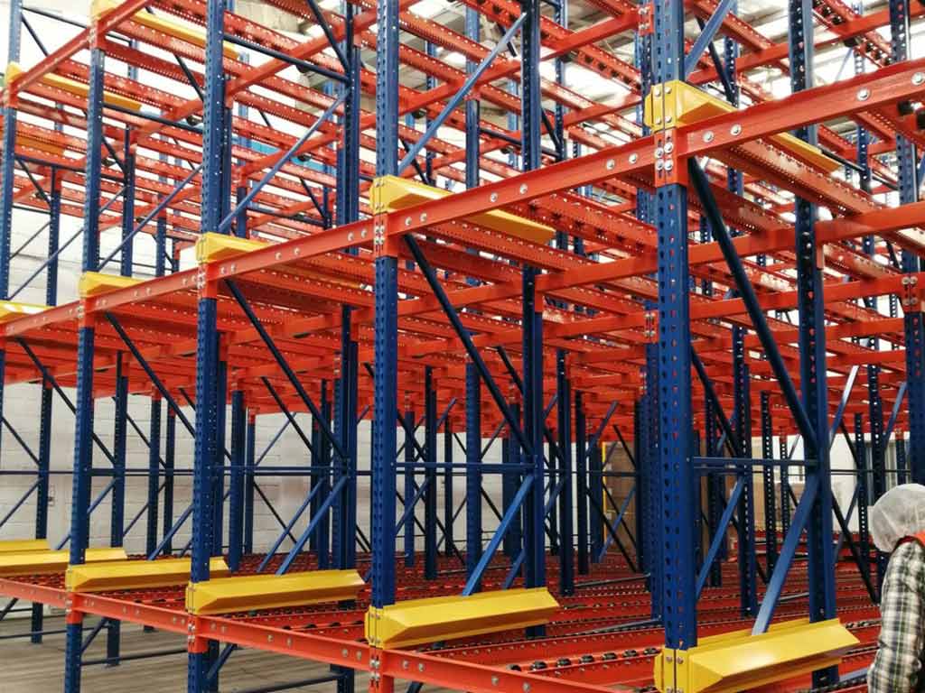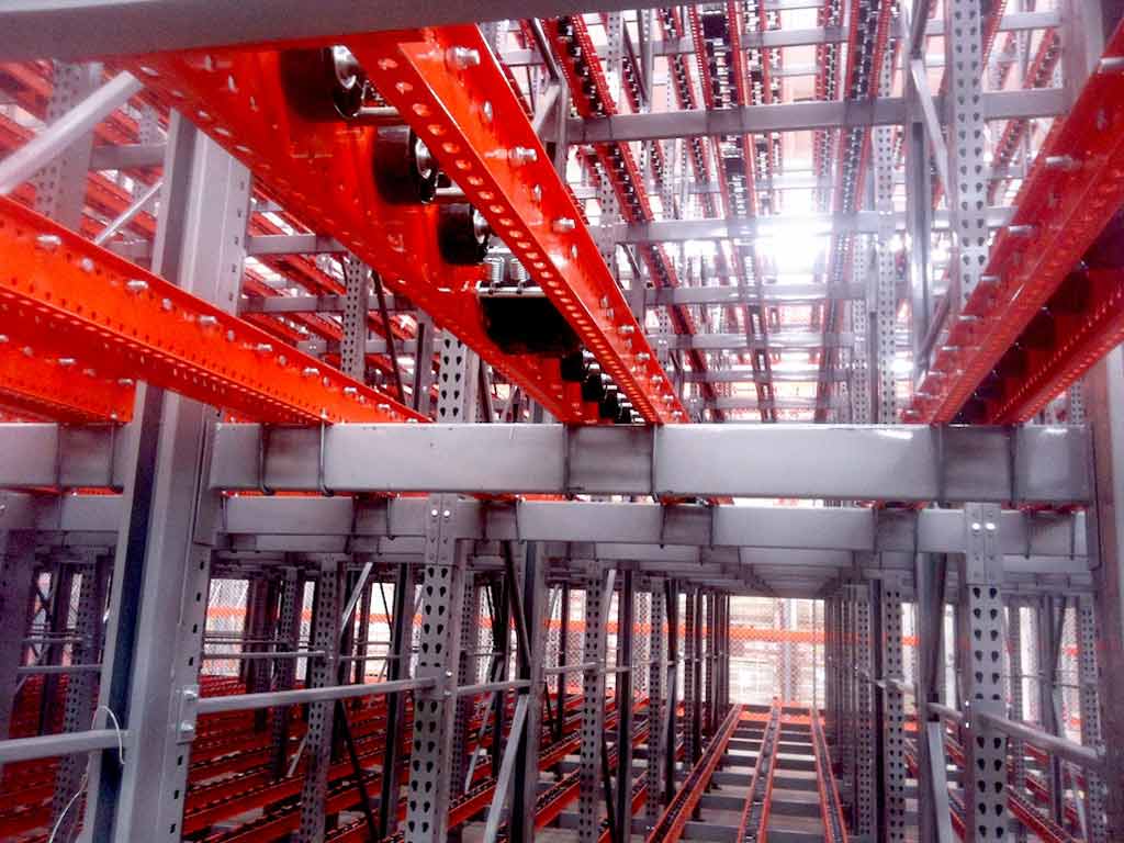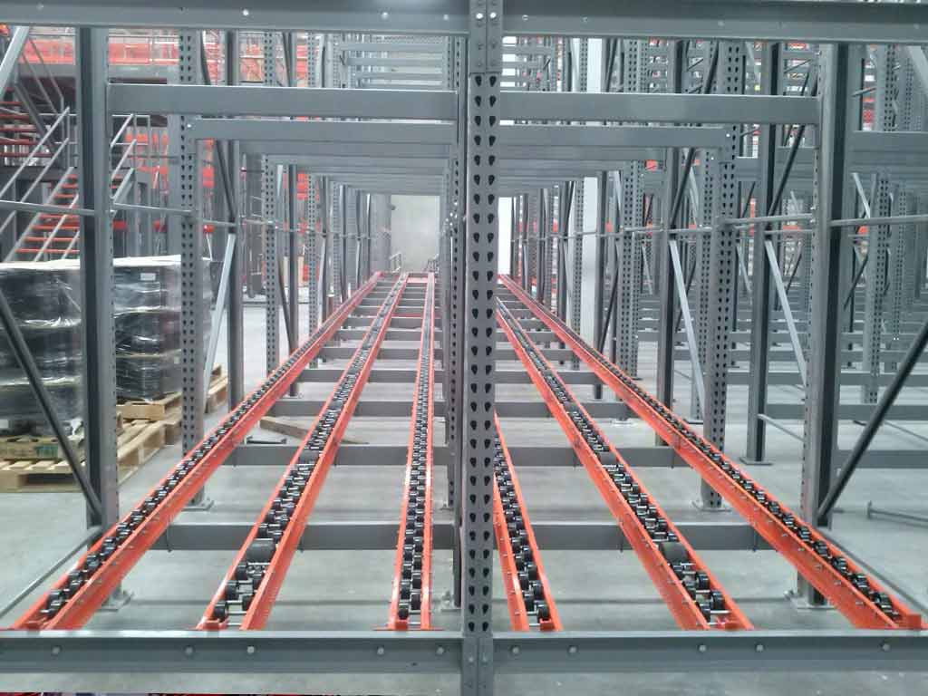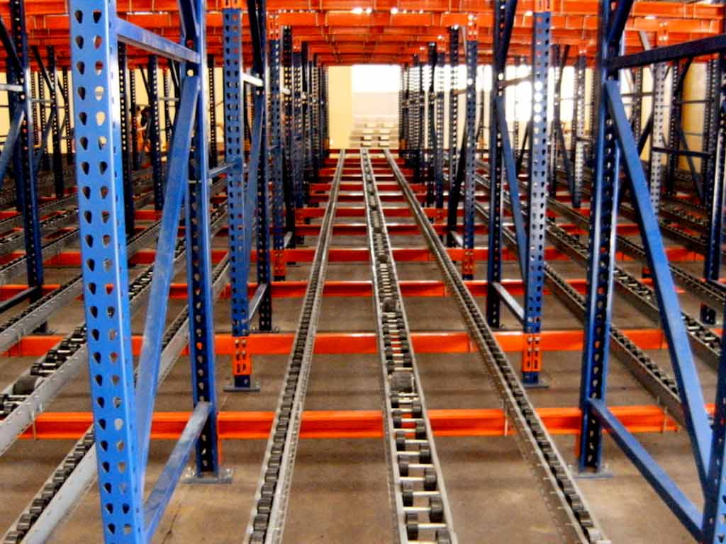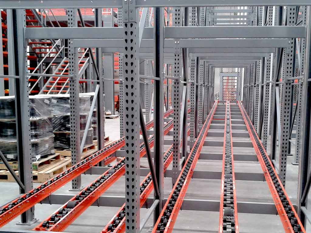 El Sistema de Rack Dinámico opera por medio de gravedad brindando almacenaje de alta densidad que se logra combinando Racks con un sistema de rodamientos de un diseño especial en plano inclinado formando túneles por los que las tarimas avanzan con una velocidad controlada gracias a los frenos que se encuentran en este sistema de rodamientos. Se combina aprovechamiento de espacio y rotación de stock por medio de Primeras Entradas-Primeras Salidas (PE-PS). Al retirarse una tarima, de inmediato se deslizan las tarimas restantes hasta llegar a un tope el cual es un punto de ataque..